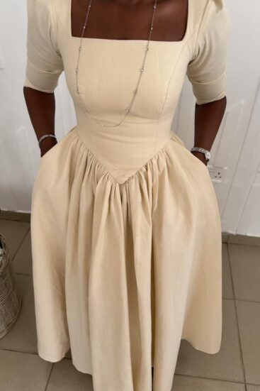 ₦94,063A linen free dress with with nifastudio button detail In the middle Colors – beige and black back zipper Model is 5'8 and is wearing… -