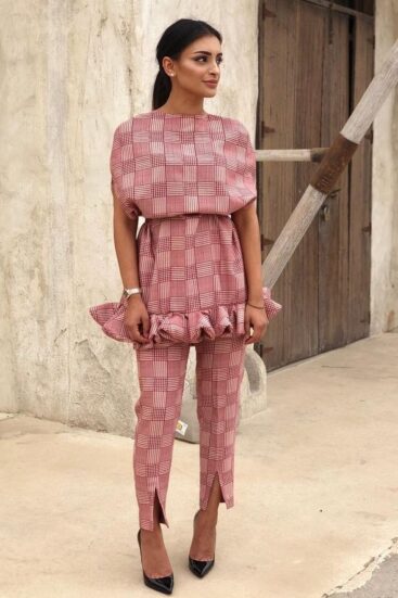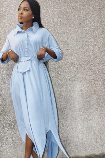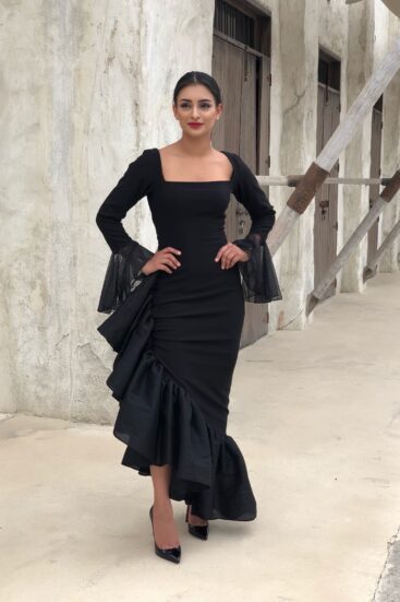 ₦107,500A STRECHY JERSEY WITH RAW SILK FABRIC USED FOR THE FRILLS AND MESH SLEEVES. Long sleeve Side zipper Model is 5'7"" and is wearing a…