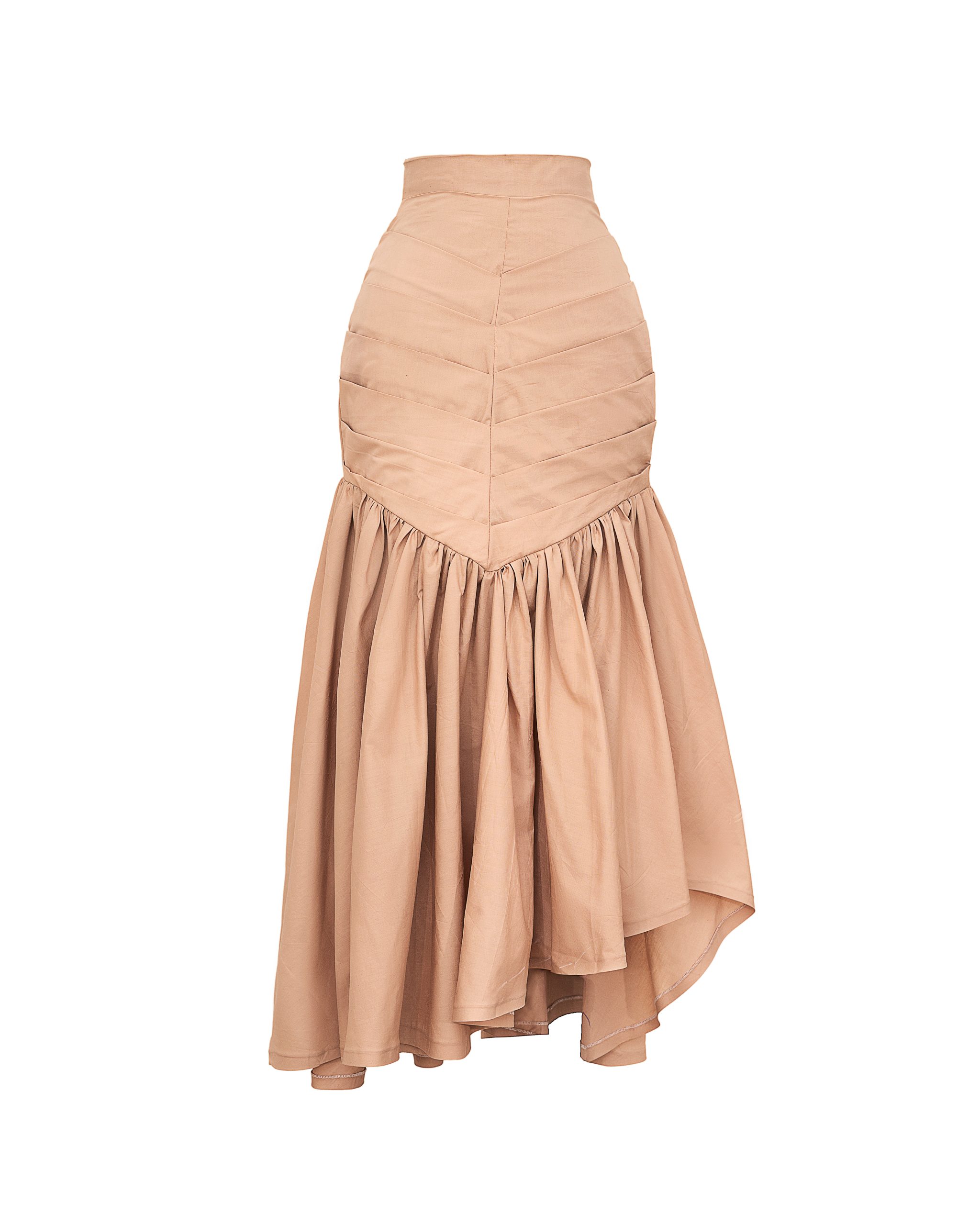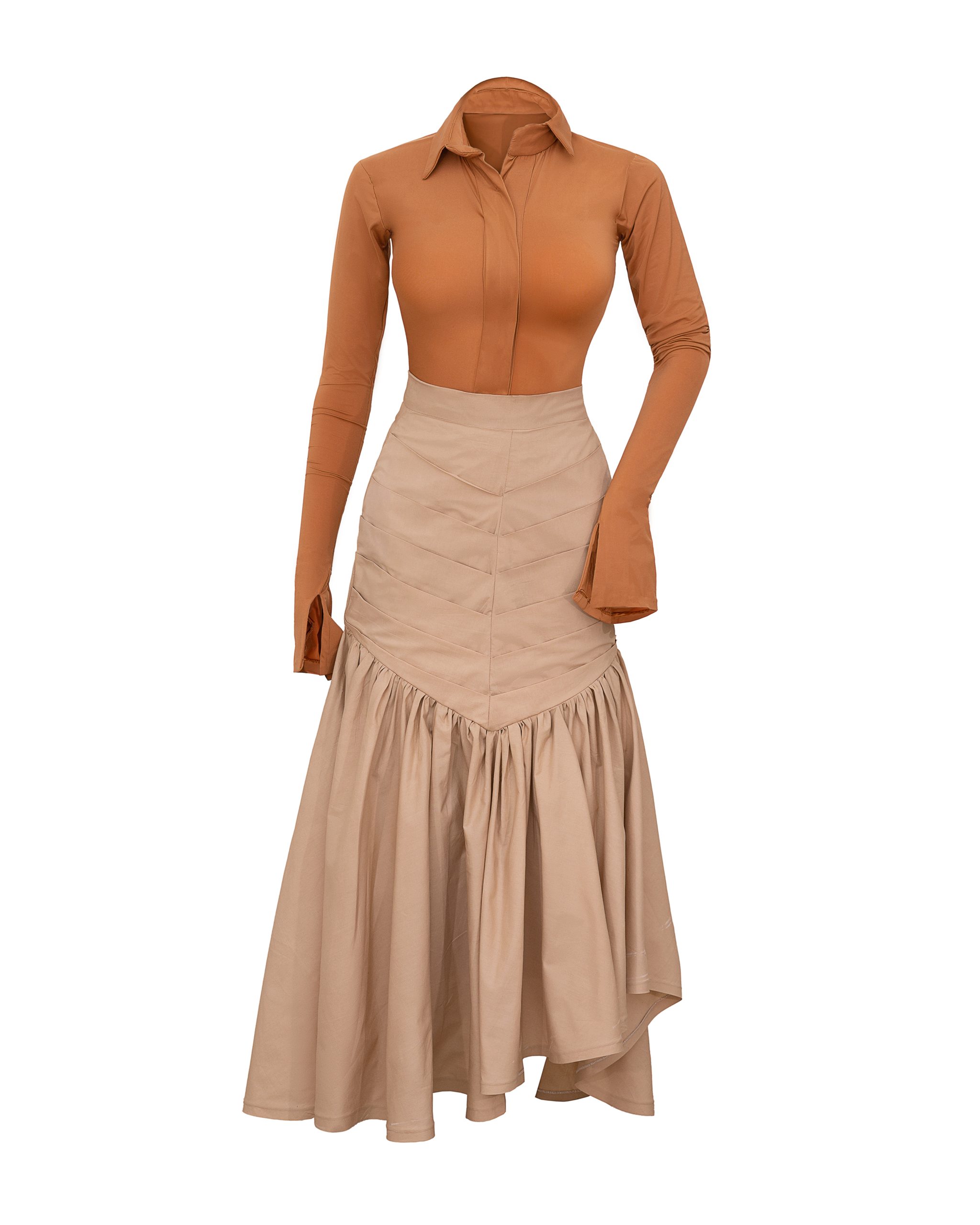 A Cotton shirt with translucent button detailing paired with a ruffle  lace skirt with a zip at the back Model is 5’8 and wearing a…