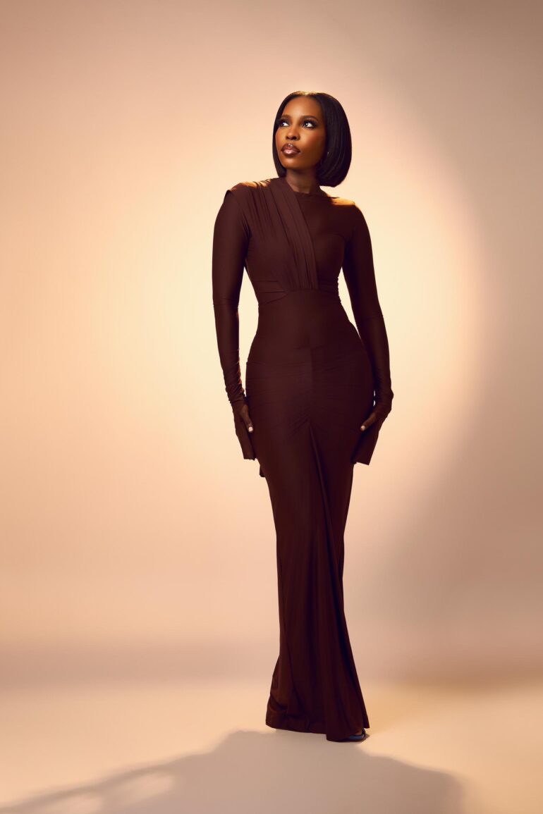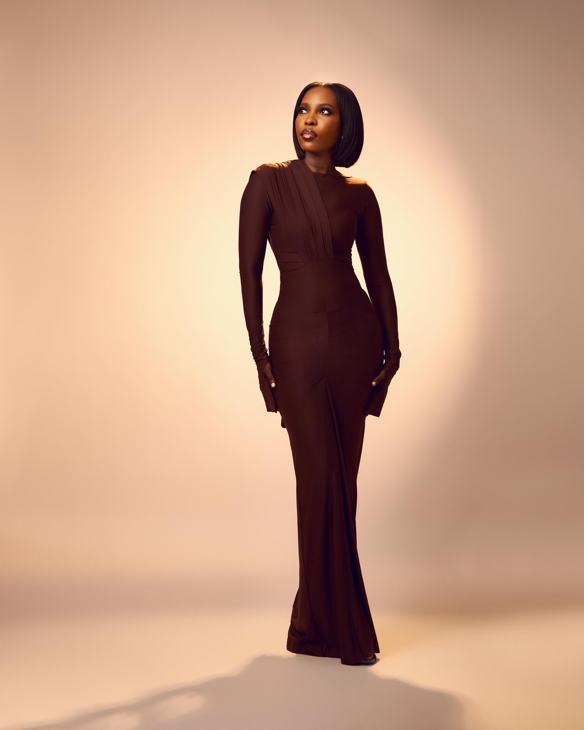A stretchy crepe fabric with extra fabric detail on the chest that can be styled however you want to Long fitted to the hip no…
