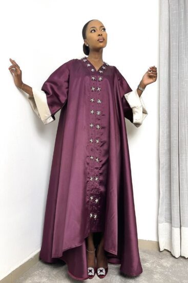 A ONE SIZE FIT ALL BUBU WITH EMBELLISHMENT MIKACDO SILK HIGH LOW DRESS STONED NECKLINE Kimono style sleeve Hand wash cold, line dry Fits true…
