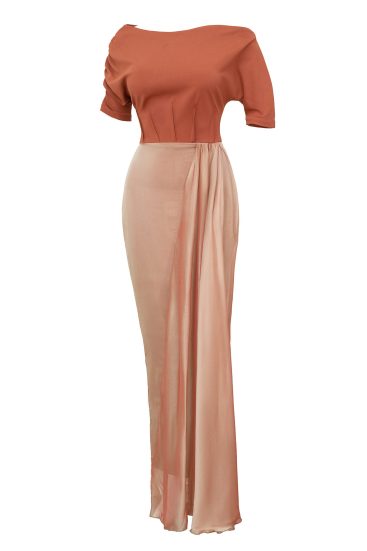 A TWO TONED DRESS. CREPE AT THE BACK AND PLEATED CHIFFON AT THE FRONT Care label 30°C cool wash 9 Do not bleach 1 Cool…