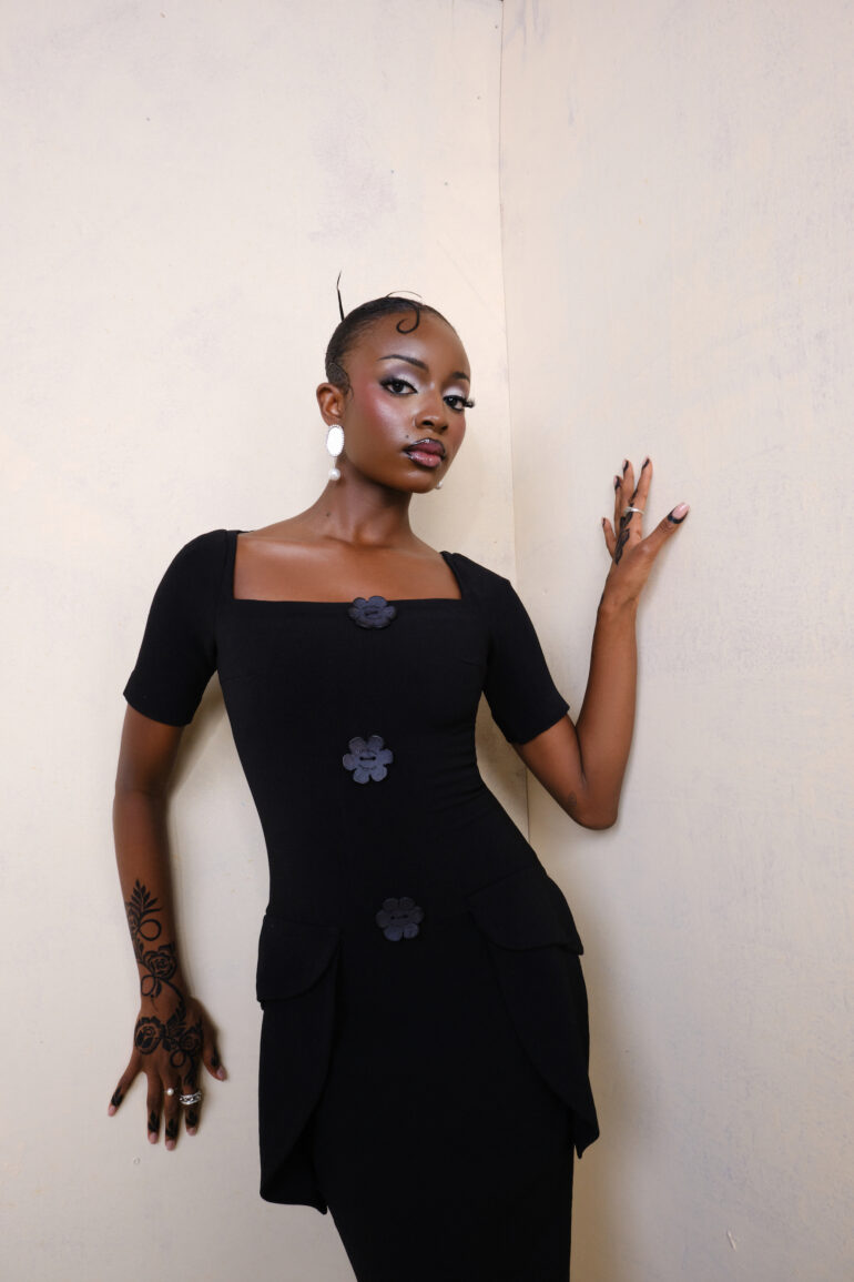 A stretchy, straight fitted dress with a square neckline and customized nifastudio buttons across the chest