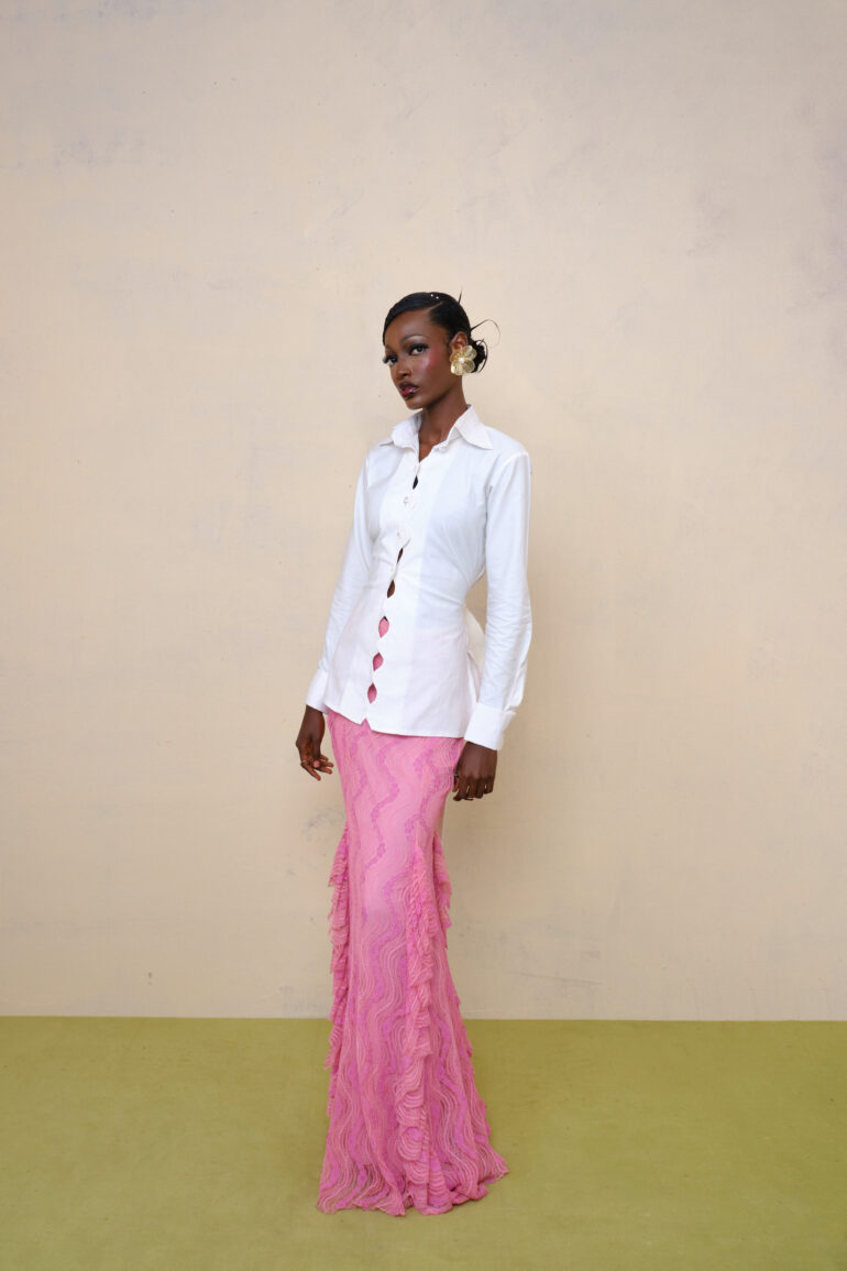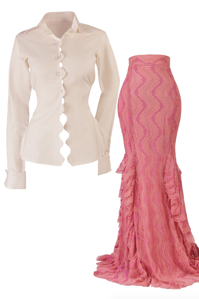 A Cotton shirt with translucent button detailing paired with a ruffle lace skirt with a zip at the back