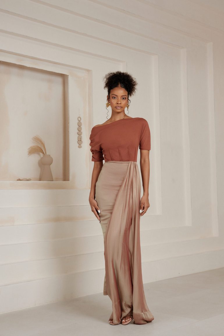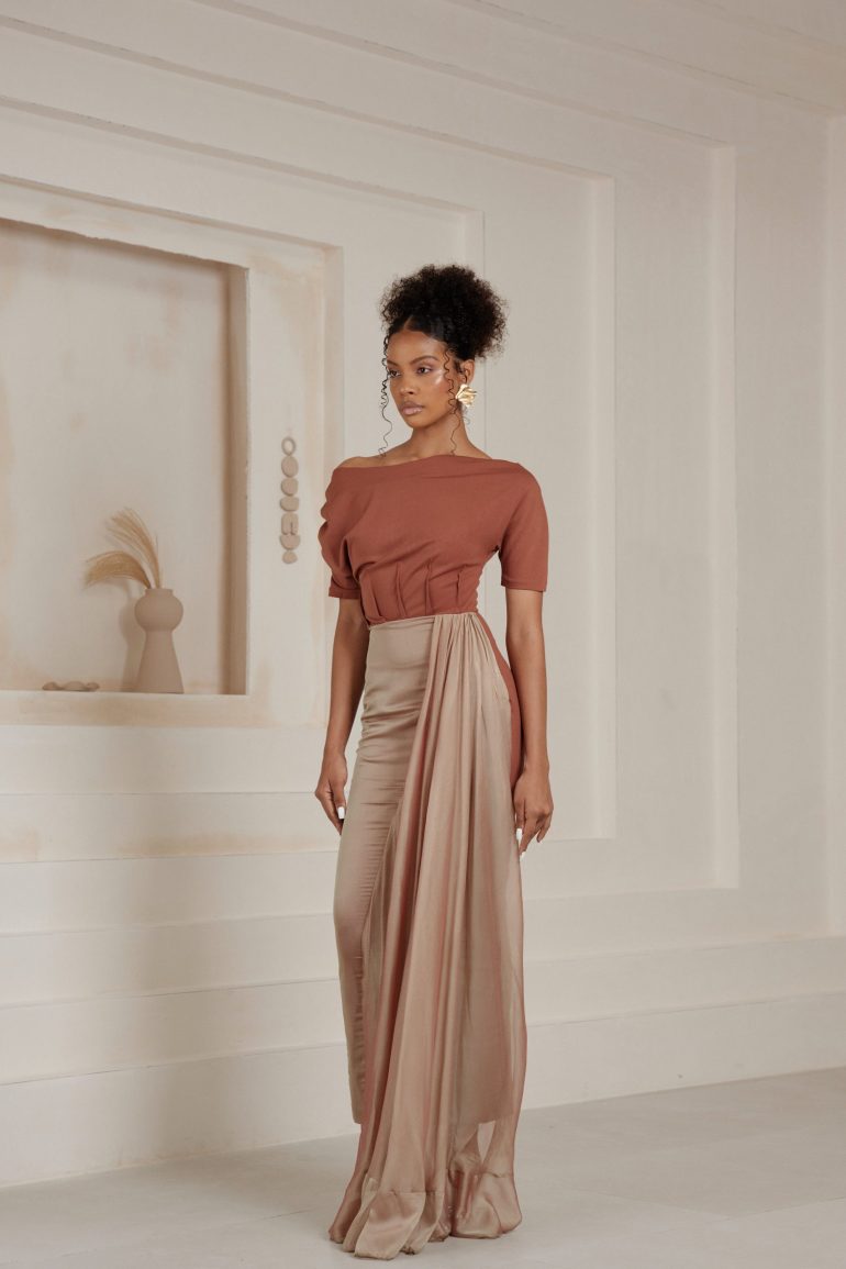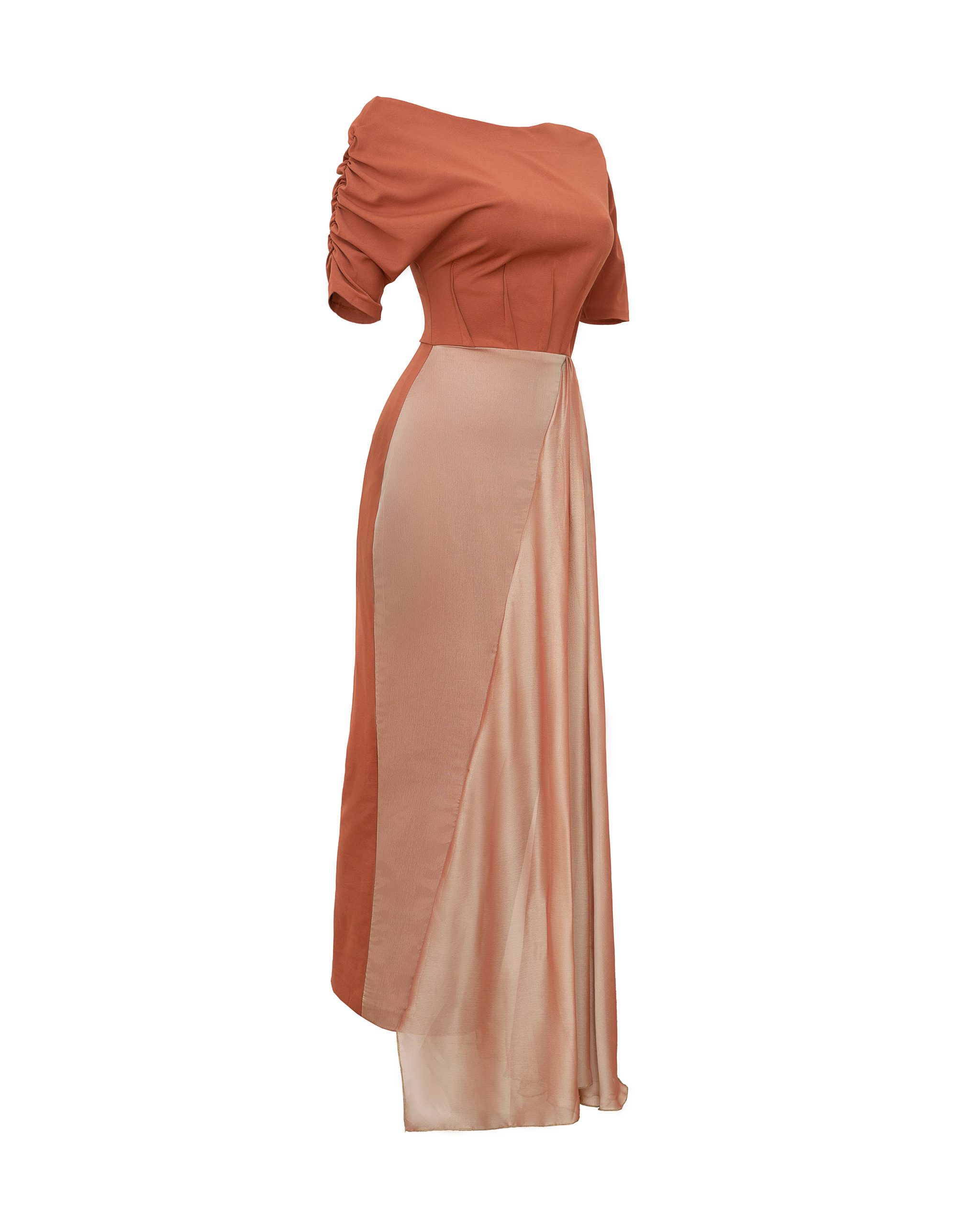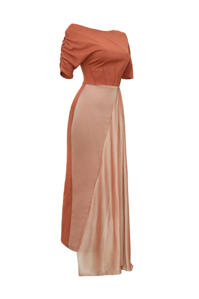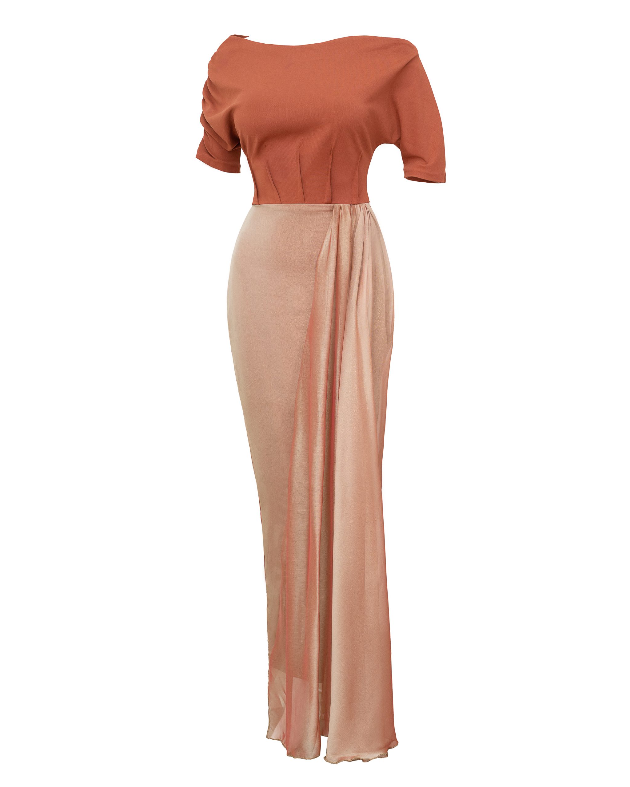 A stretchy Jersey fabric with a soft, rich silk chiffon with two tone color of sage green and burnt orange.