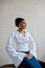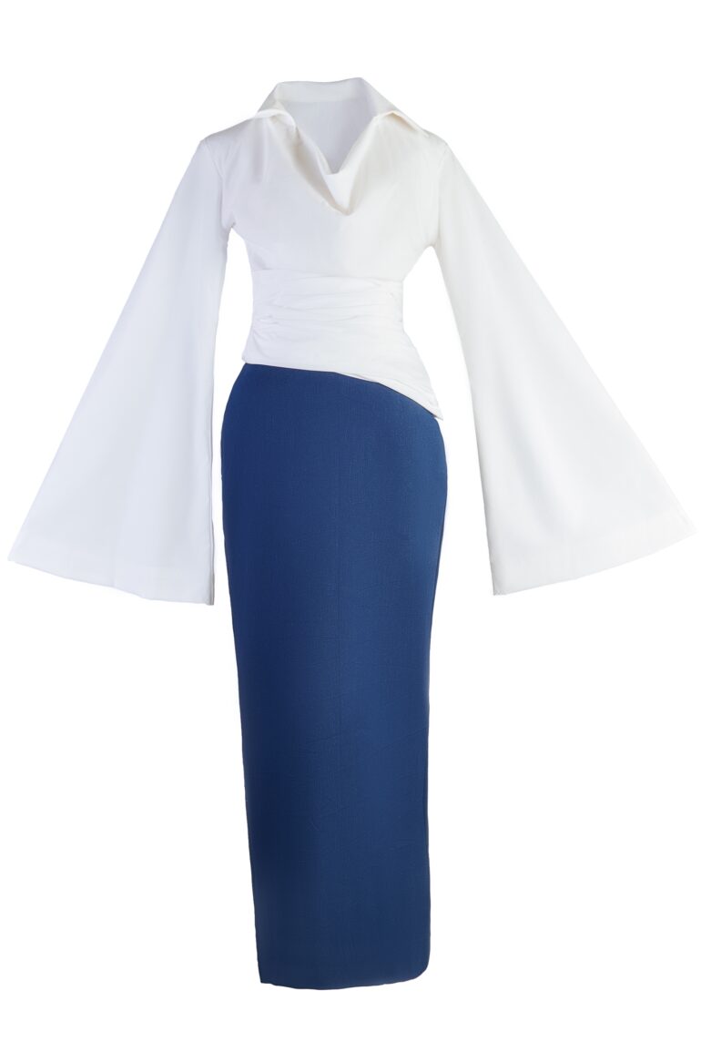 A cowl neck cotton asymmetric top paired with a pencil denim skirt