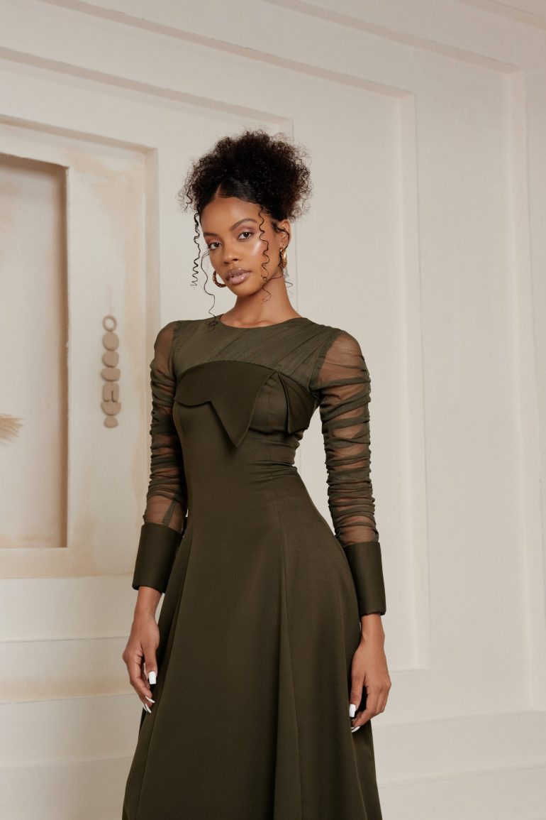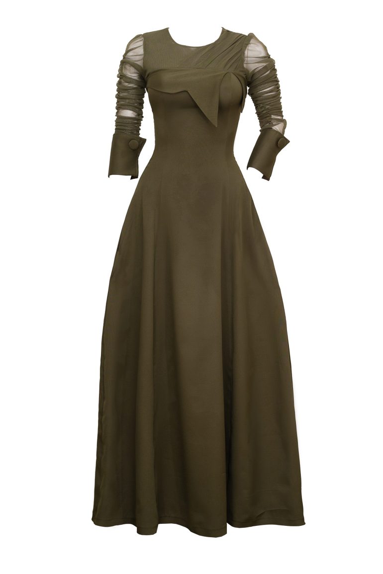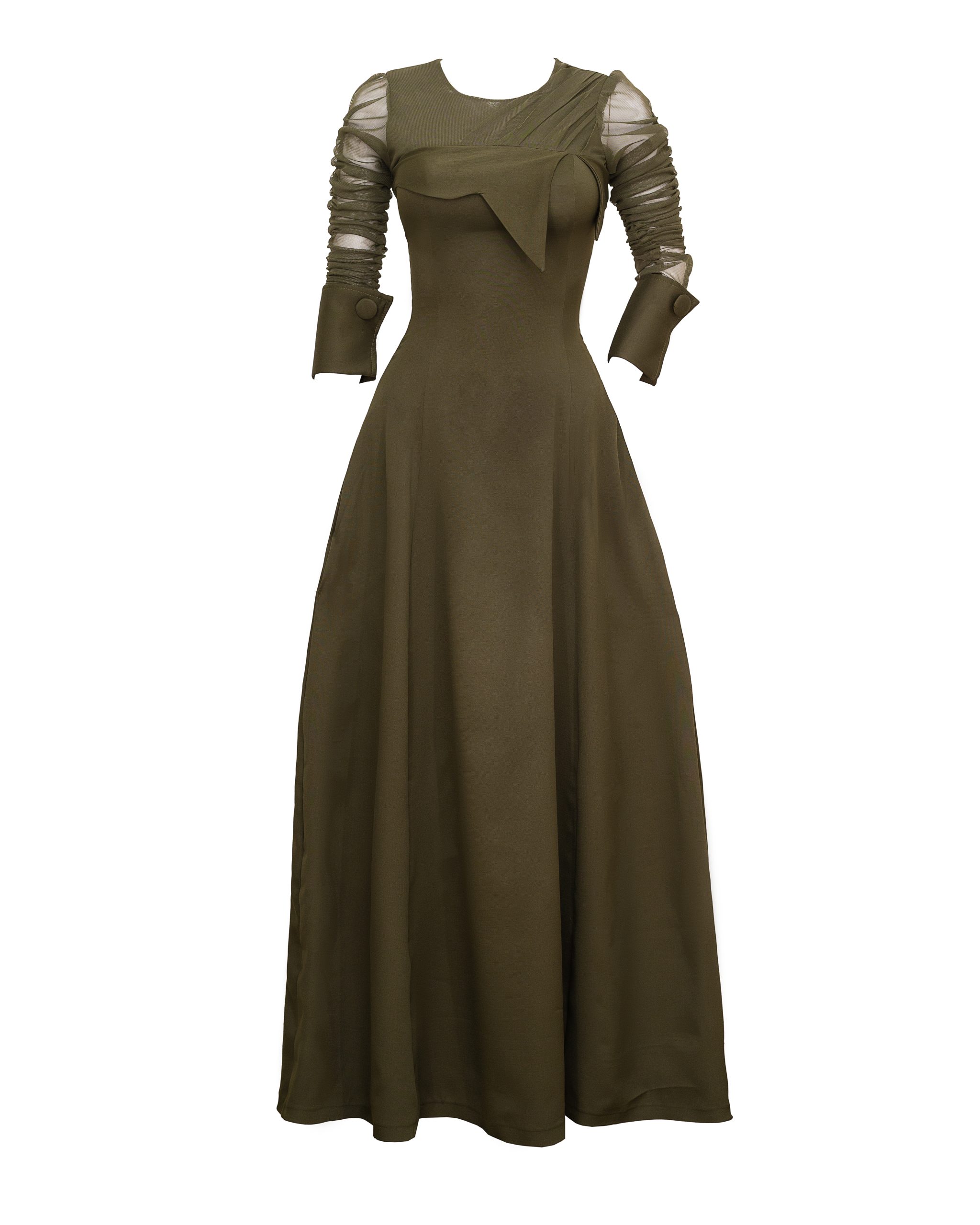 A soft crepe fabric with a stretchy mesh fabric at the top, with ruffle sleeves.
