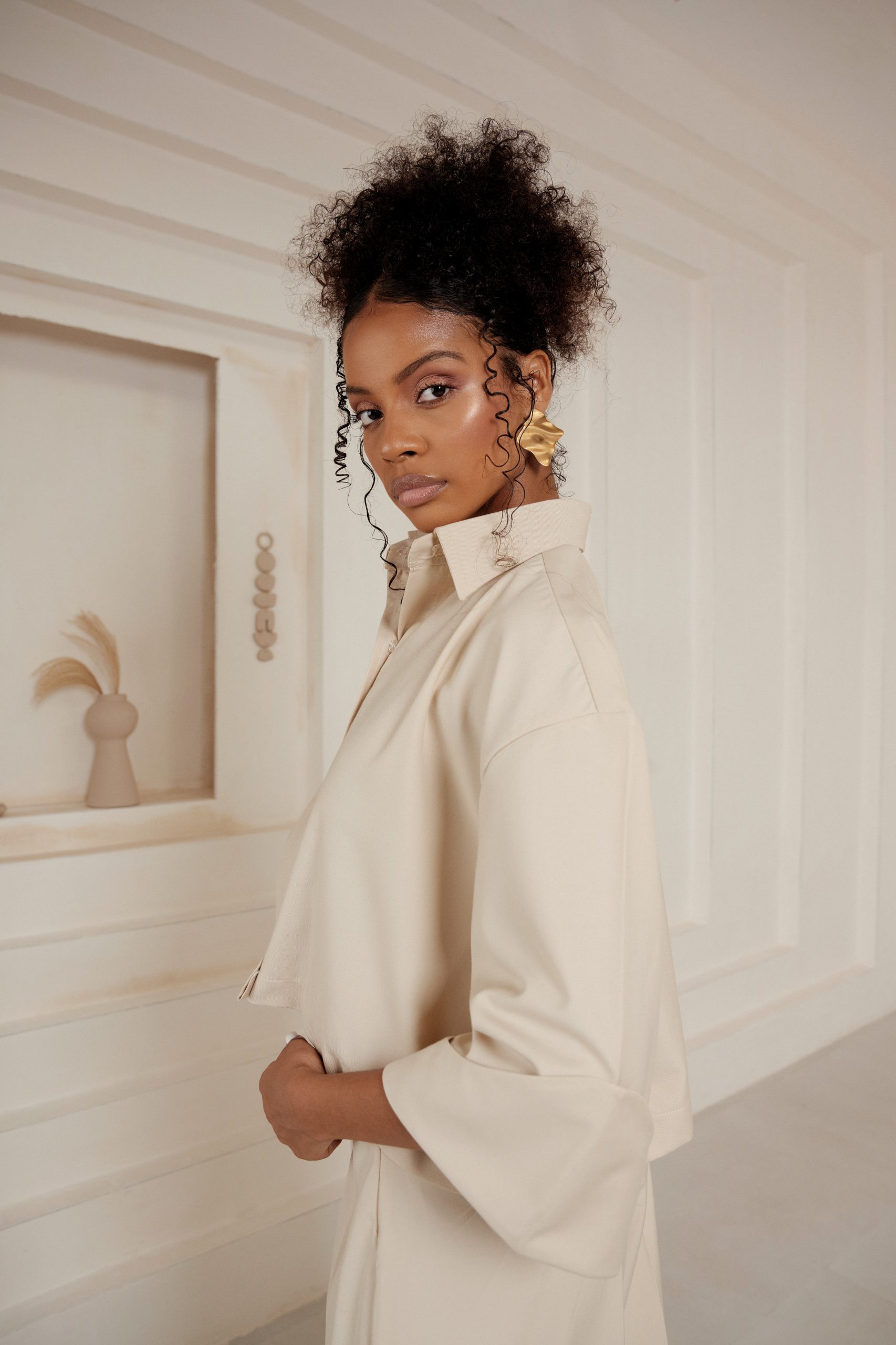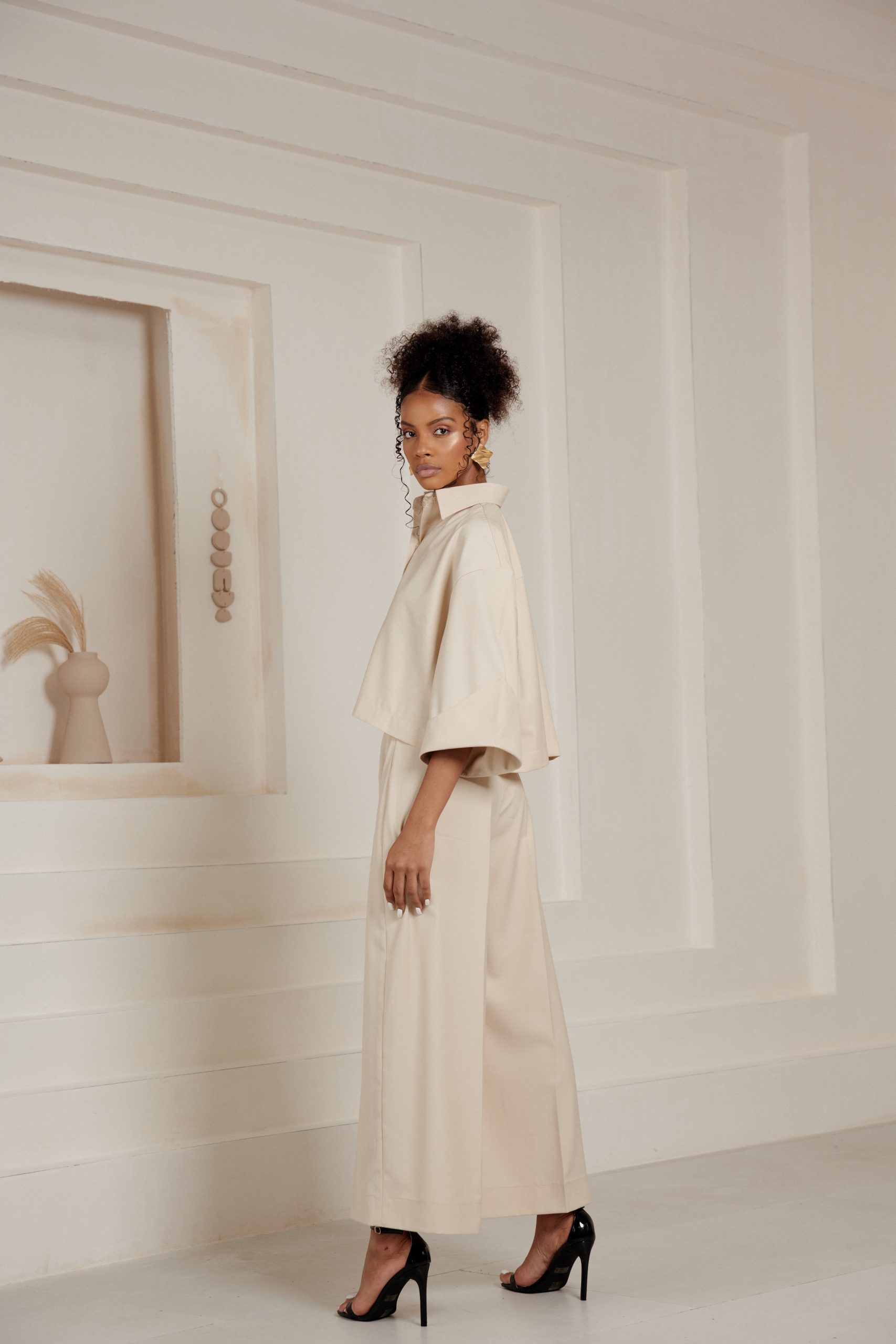 TOP-COTTON SHIRT WITH PUFFY SLEEVE AND AN OPEN BACK. IT ALSO COMES WITH A VEST PANTS- A STRAIGHT LEG PANTS MADE WITH A SOFT CREPE…