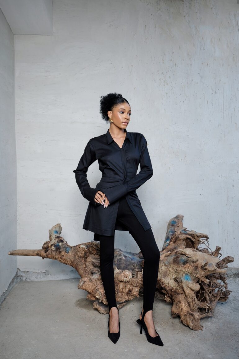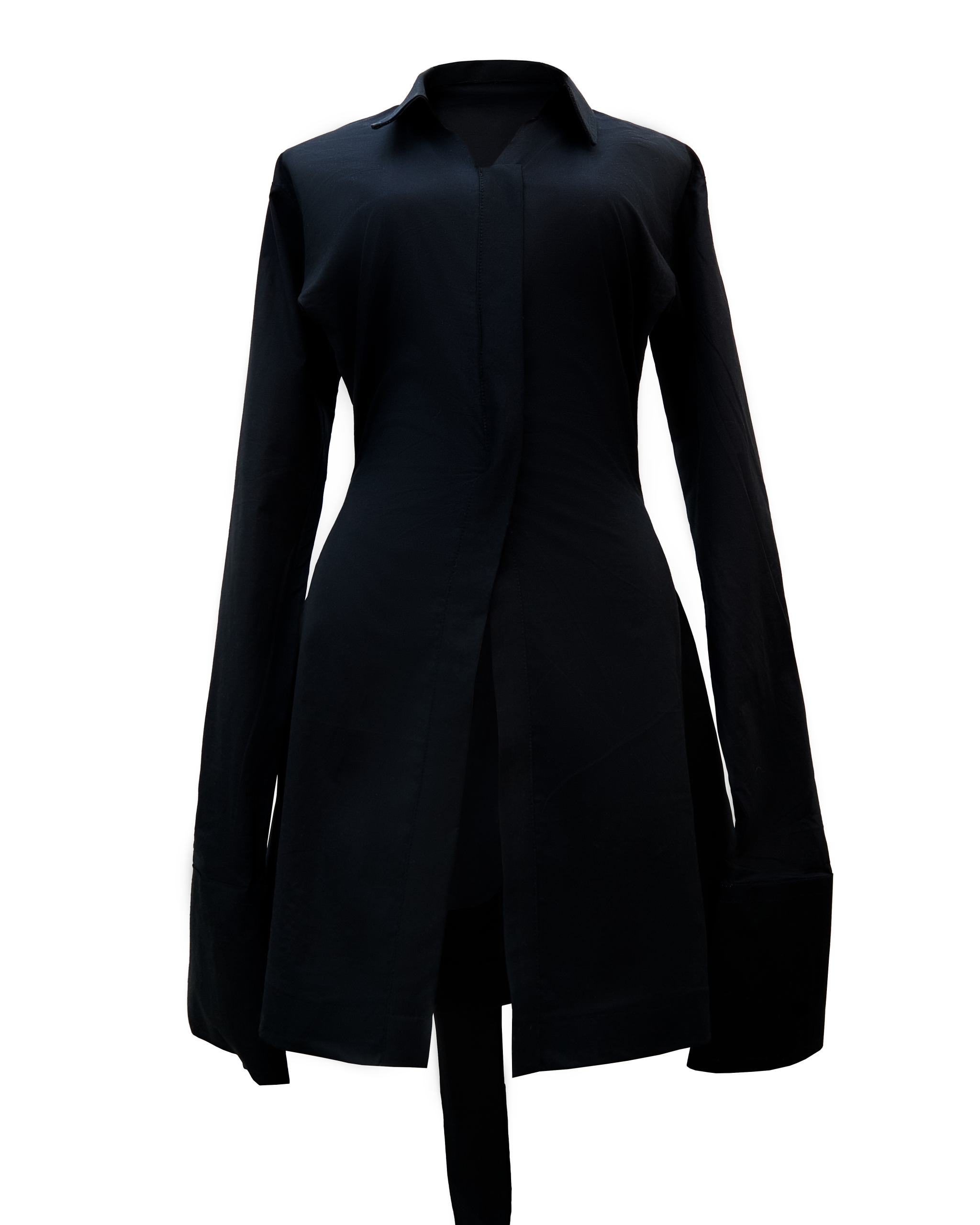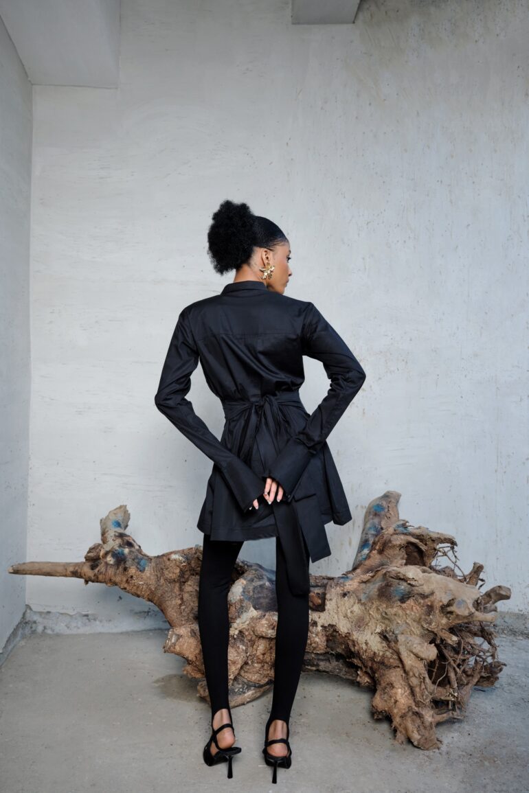 A cotton shirt with an attached belt on the side