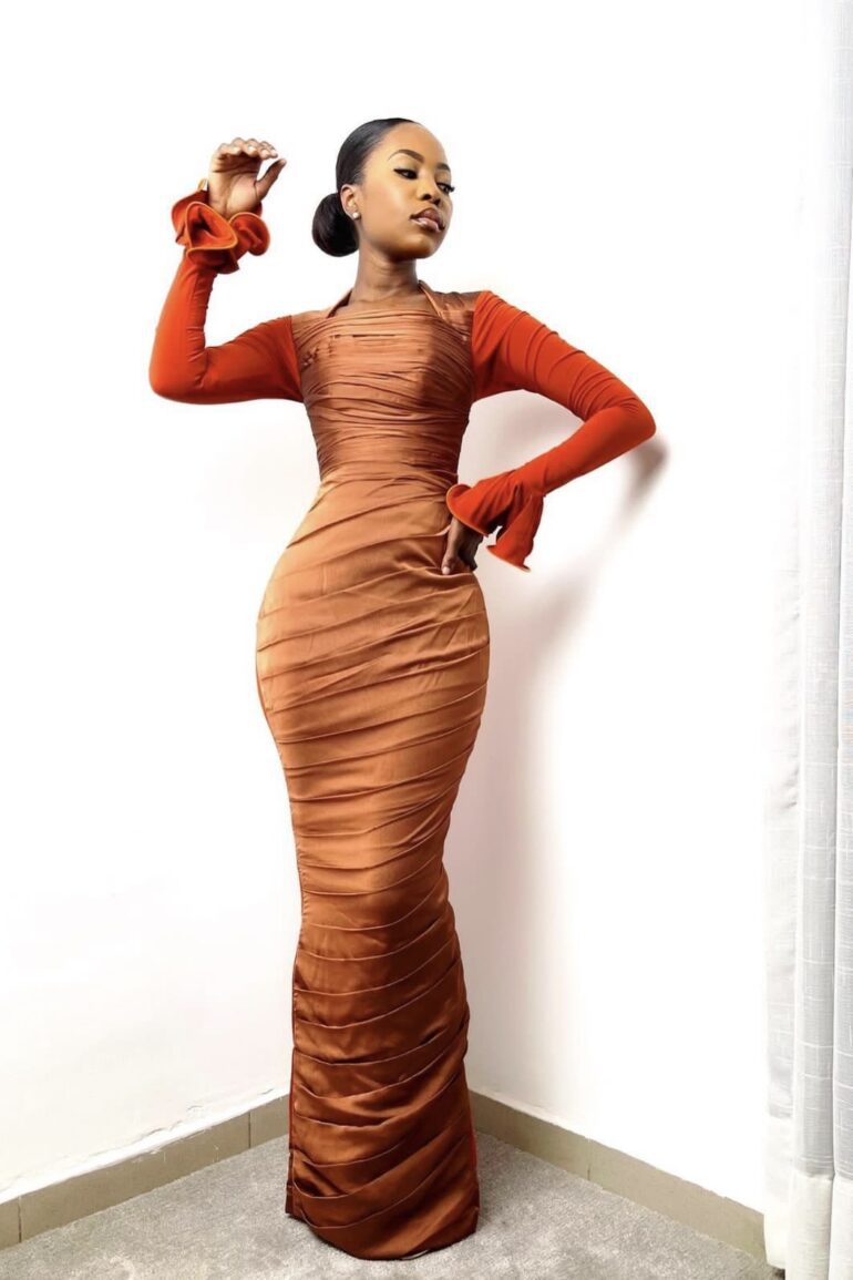 A stretchy crepe fabric with extra fabric detail on the chest that can be styled however you want to Long fitted to the hip no…