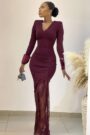 A stretchy mesh top paired with a tube top and a palazzo pants. Model is 5’11 and wearing a size 6 Back zip for the…