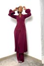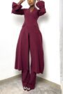 A SLIGHTLY THICK CREPE WITH A SLIT IN THE MIDDLE OF THE TOP WITH MATCHING PALLAZO PANTS.