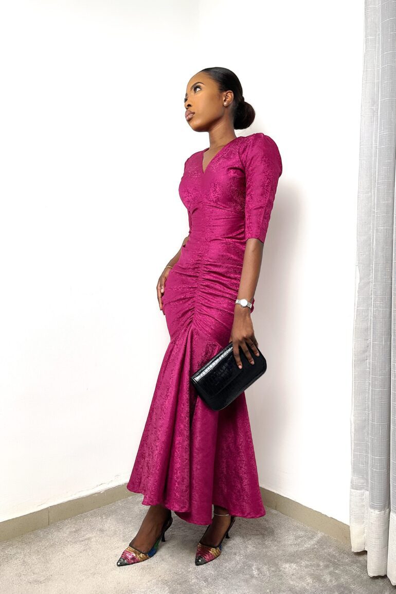 A stretchy crepe fabric with extra fabric detail on the chest that can be styled however you want to Long fitted to the hip no…