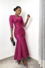 A stretchy jersey dress with an exaggerated sleeves with mesh detailing in the middle. Long sleeve back zipper Model is 5'11" and is wearing a…