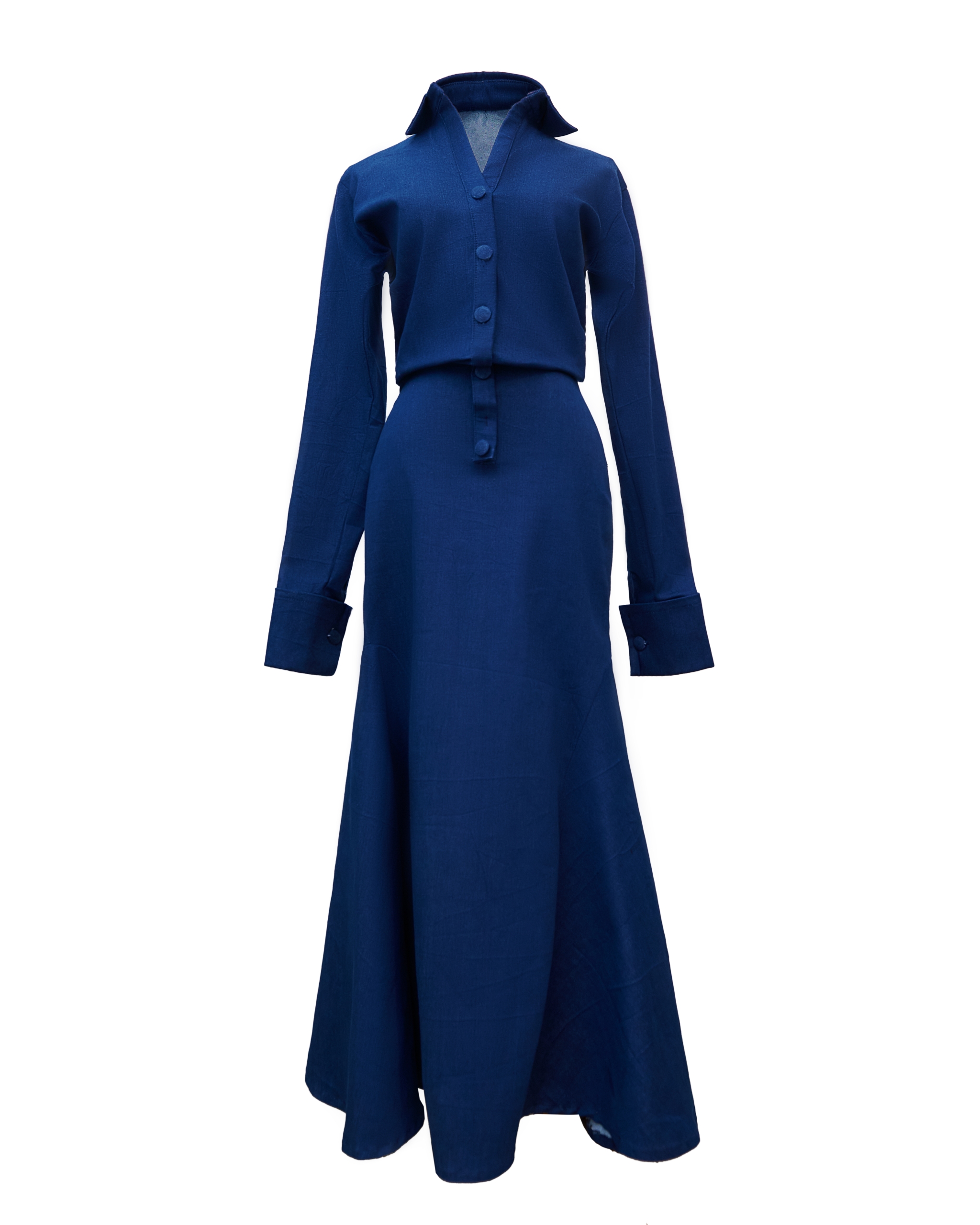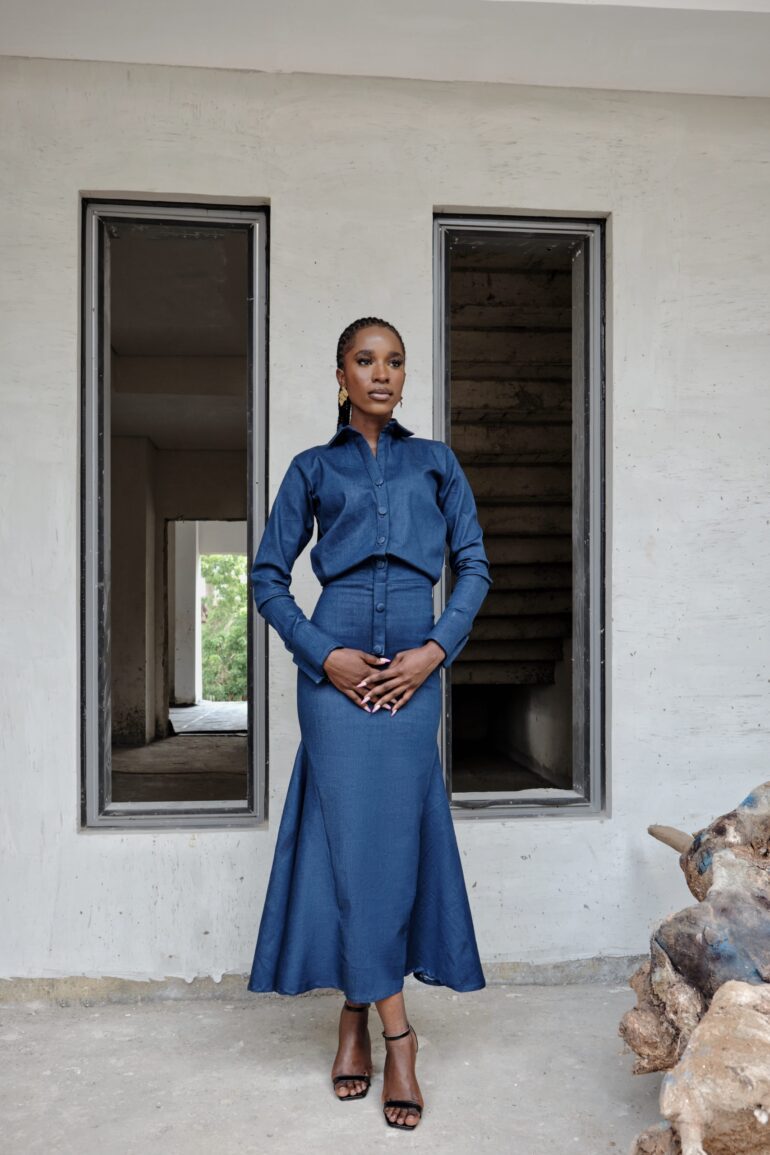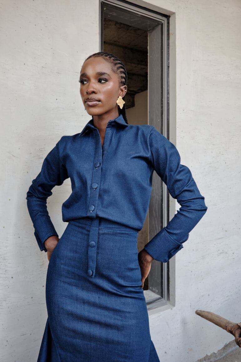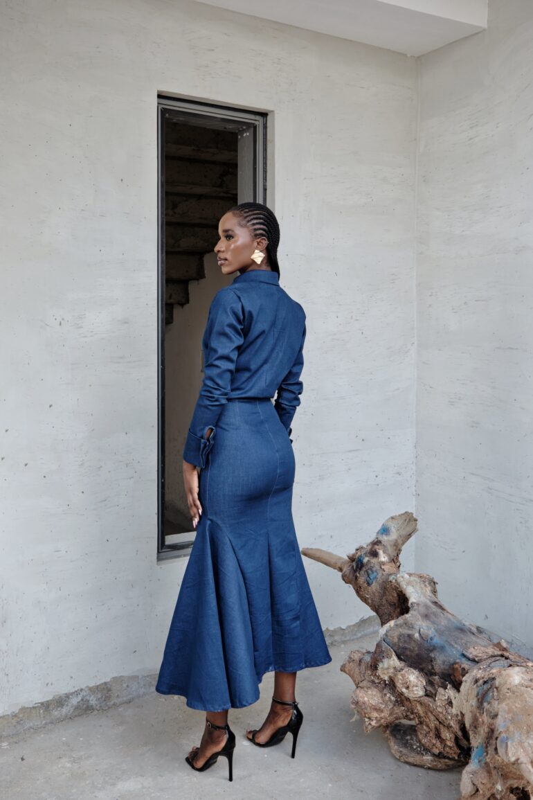 A stretchy denim dress that is designed to look like a two piece but it’s worn as a one-piece dress