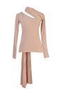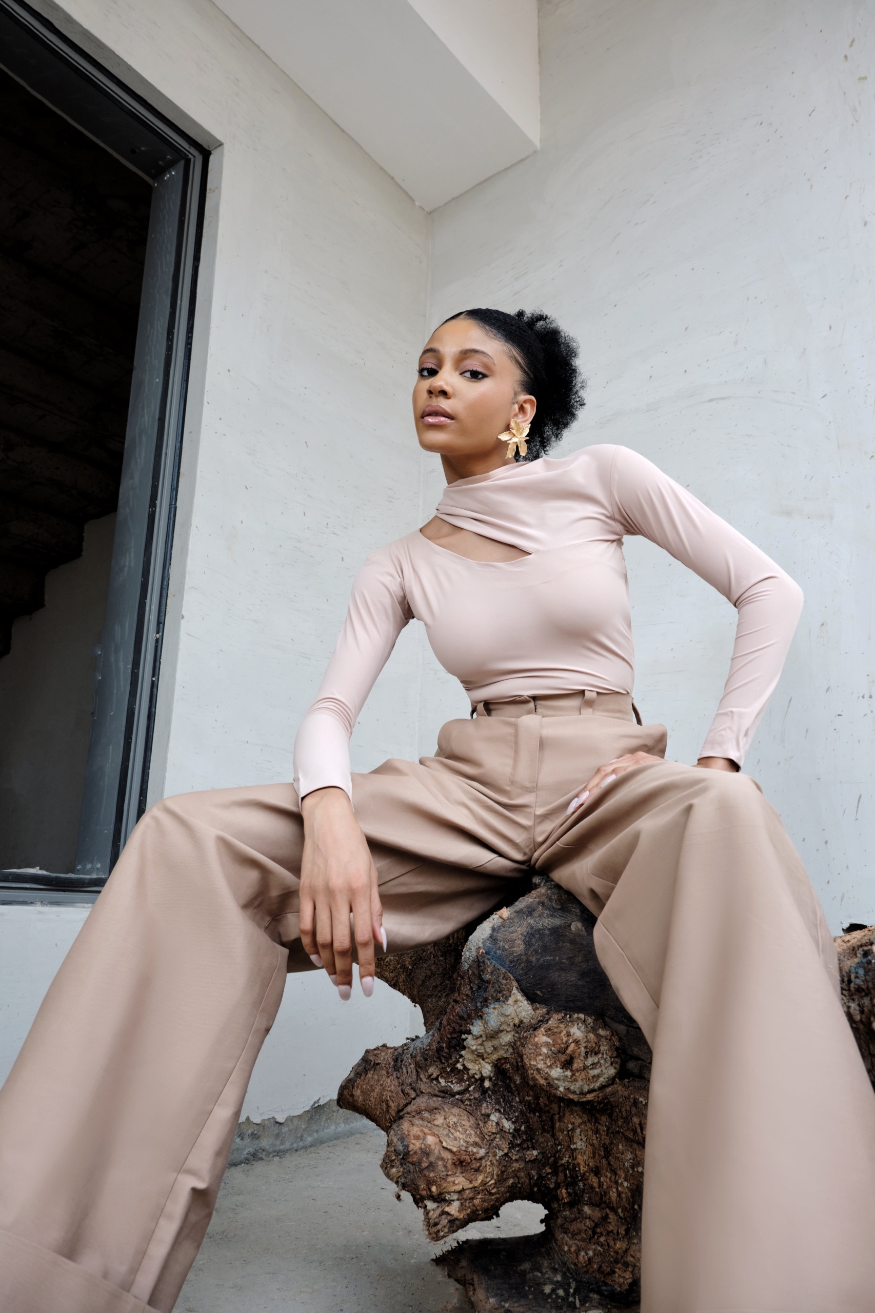 A stretchy jersey top with a draped fabric detailing on the neck paired with khaki palazzo pants with back pocket details with belt holes.