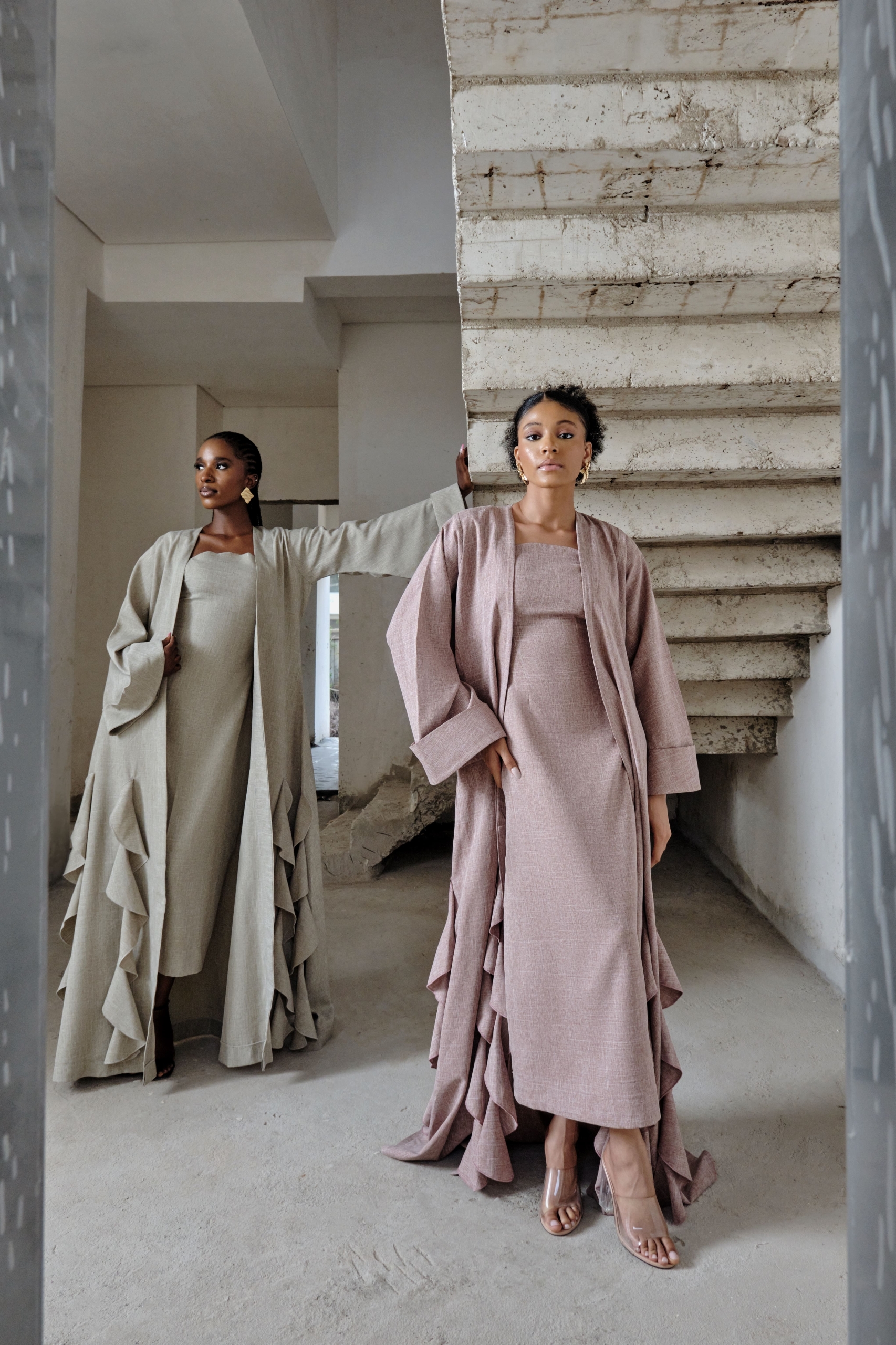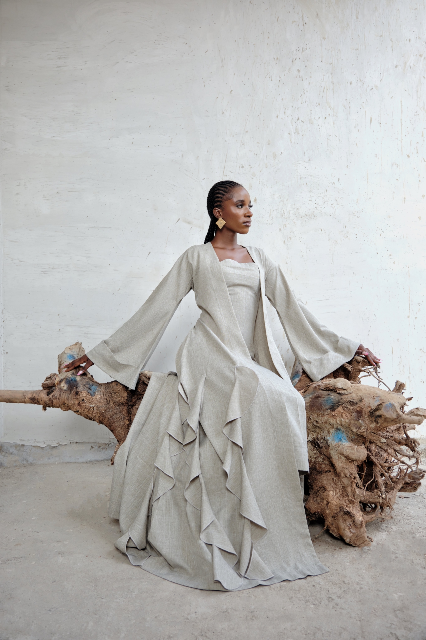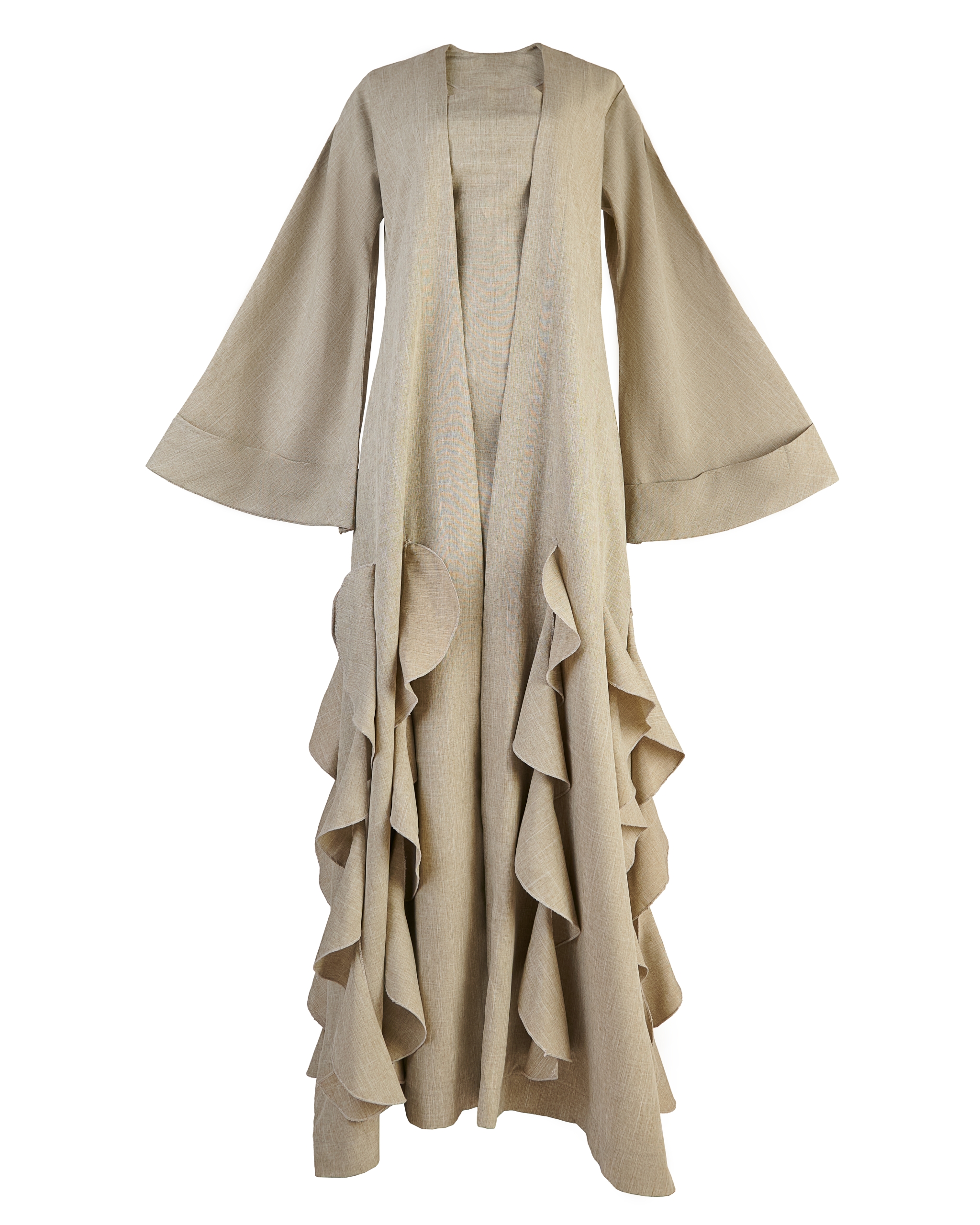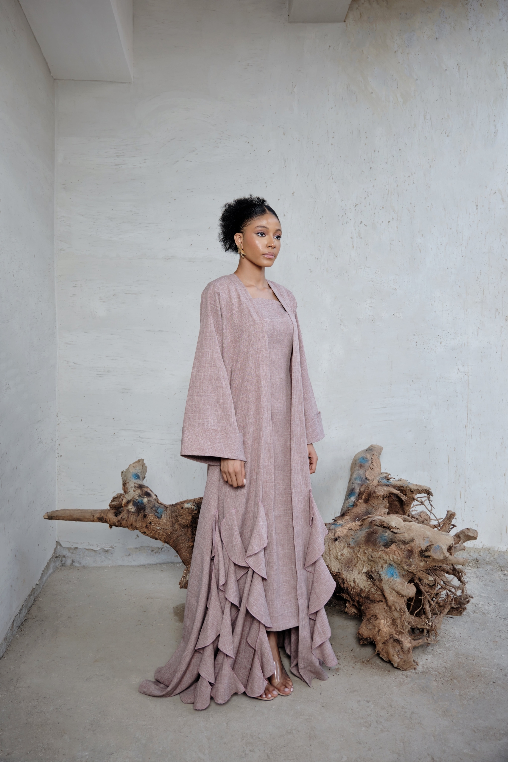 A linen midi dress with cap sleeves paired with a kimono with ruffle details at the bottom