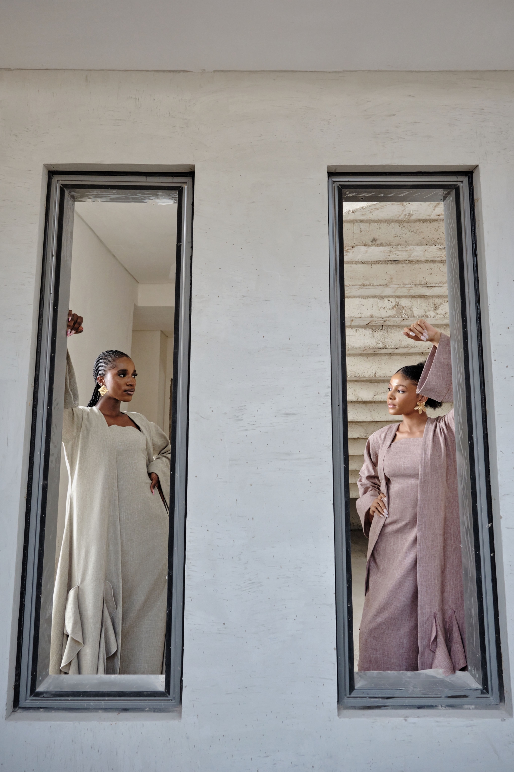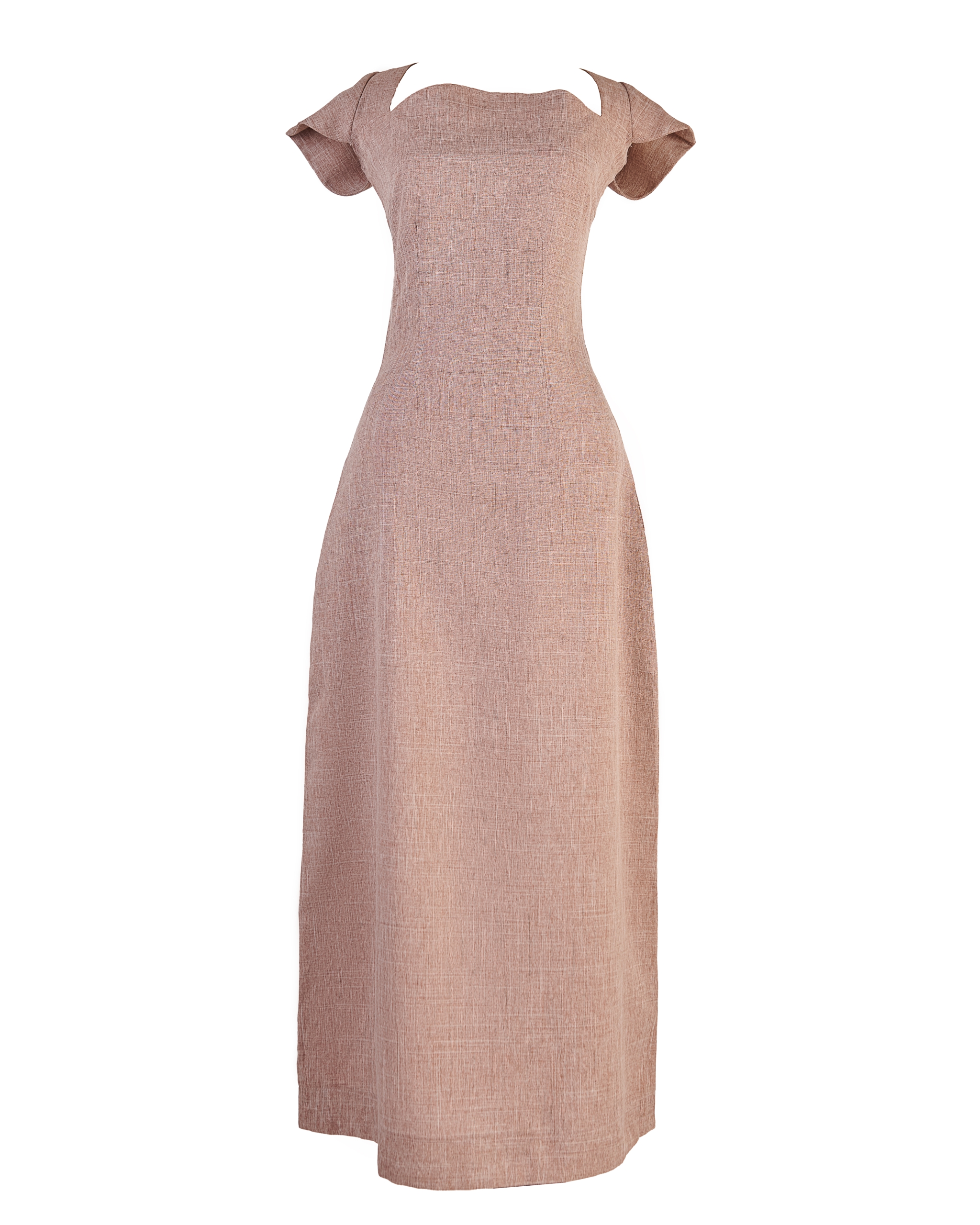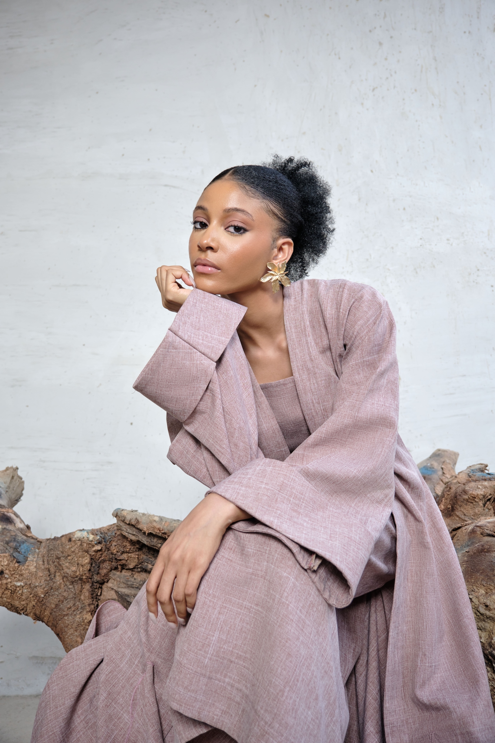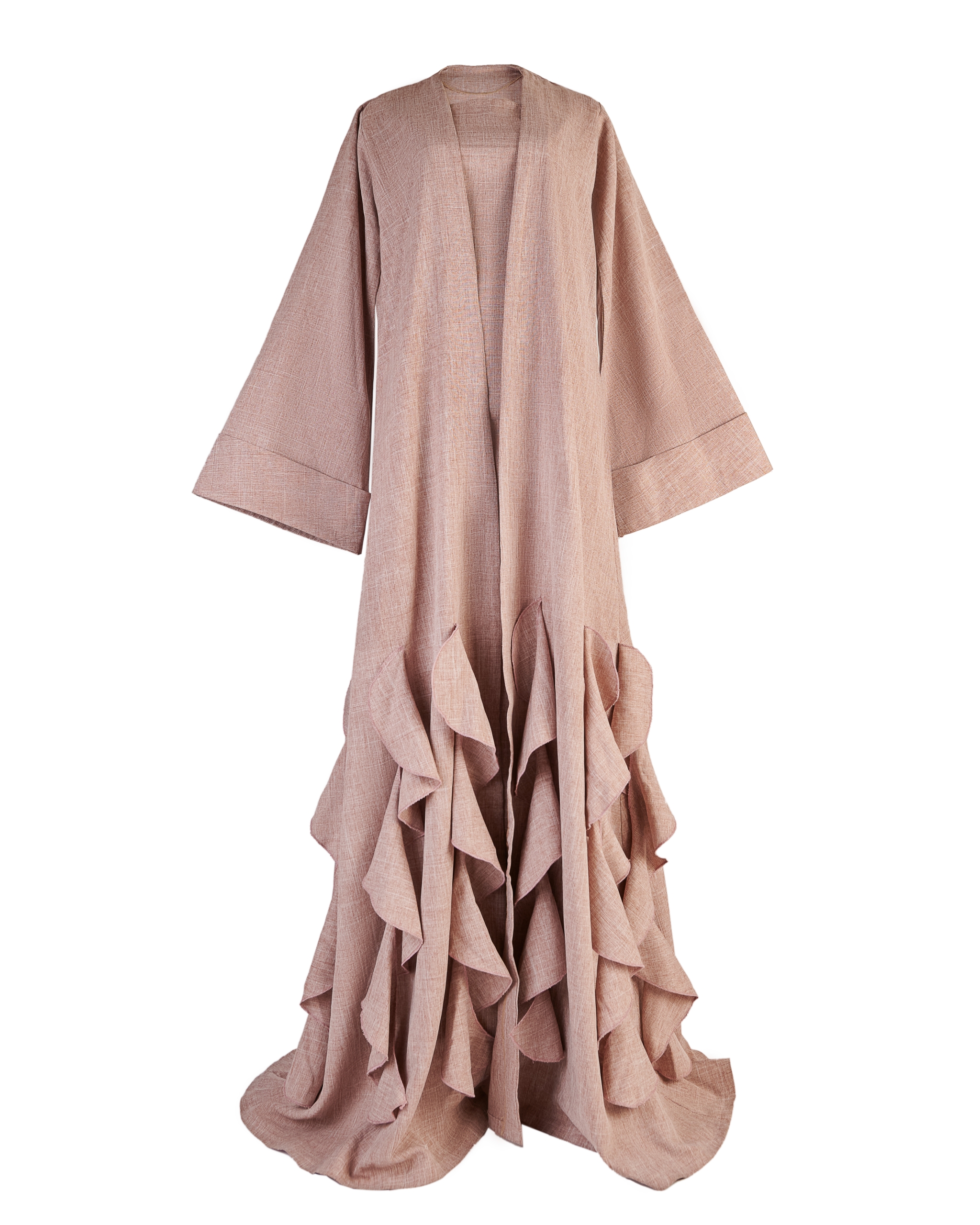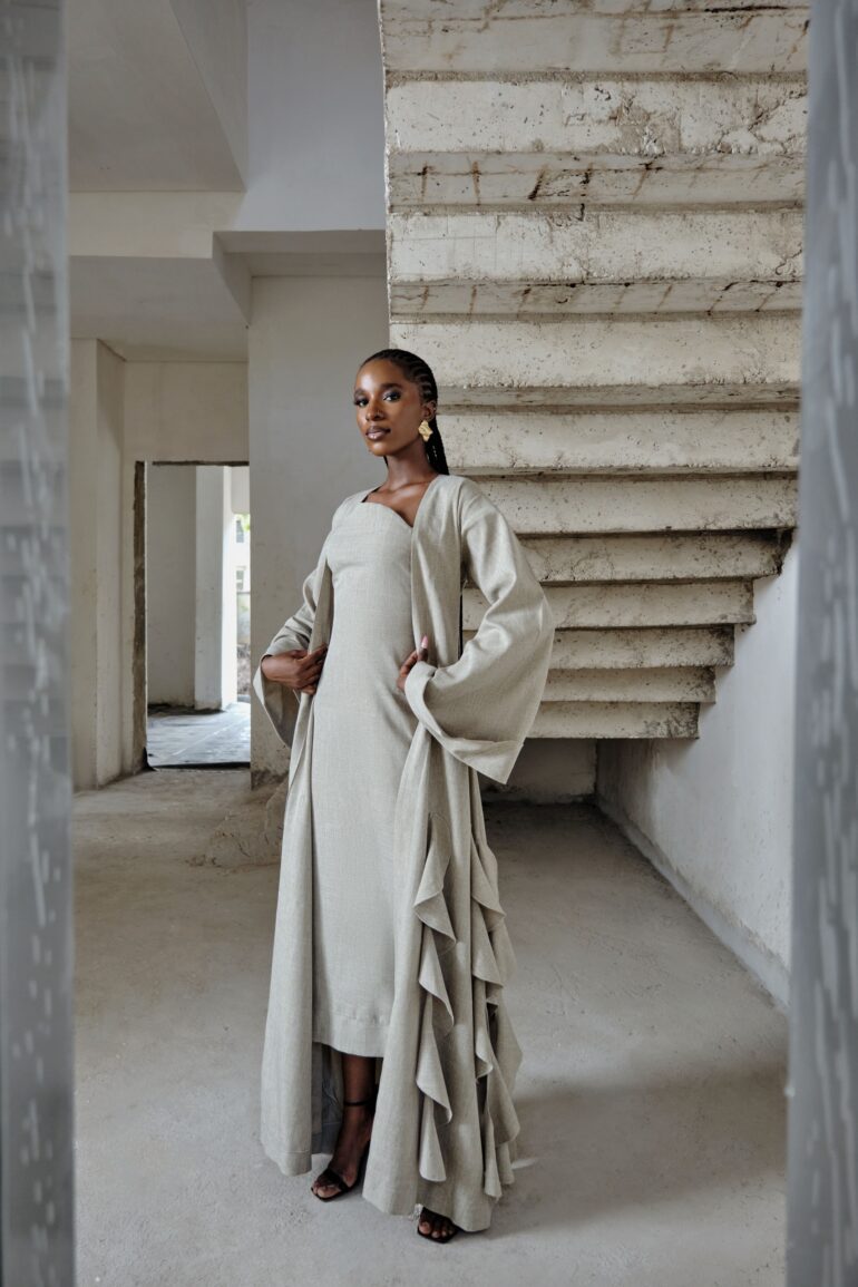 A linen midi dress with cap sleeves paired with a kimono with ruffle details at the bottom