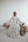 A linen free dress with pleated details around the neckline Long puffy sleeve Back zipper Model is 5'11" and is wearing a size 6 Care…