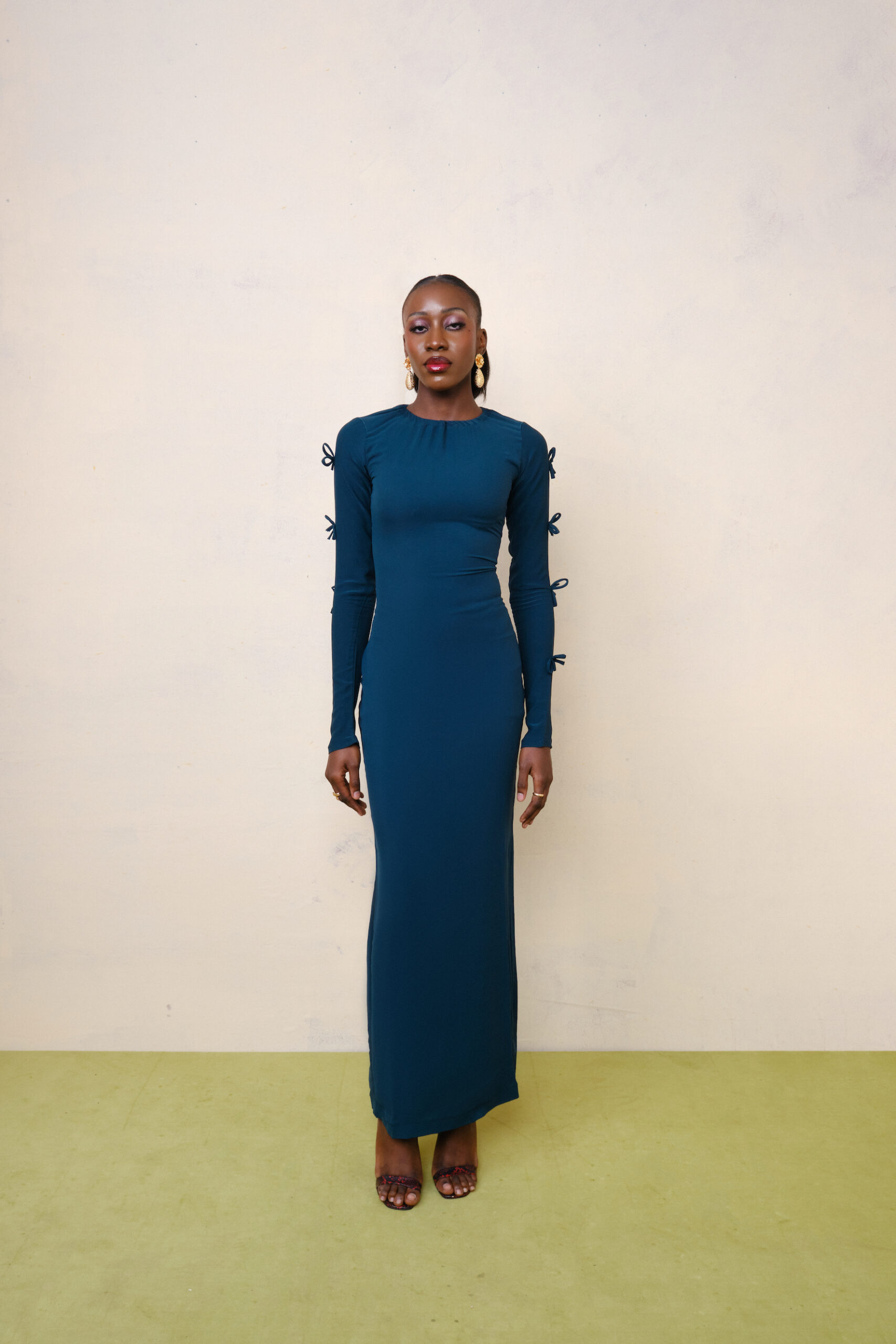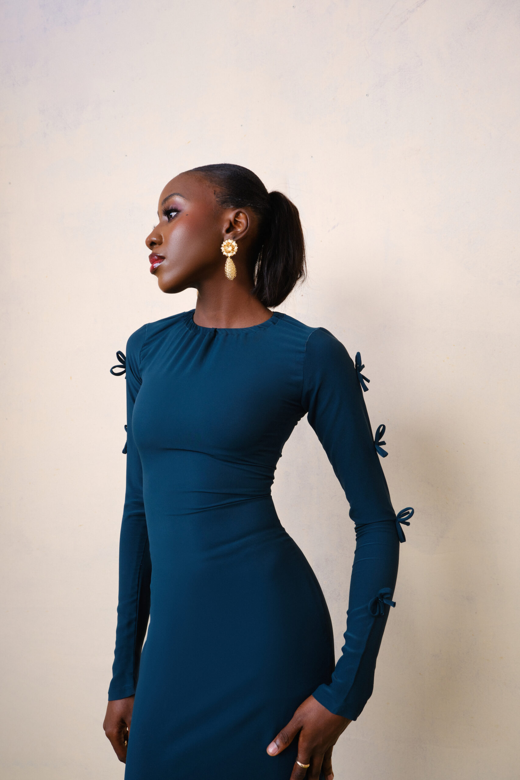 A special soft crepe fabric with tiny bow details on the sleeve with the