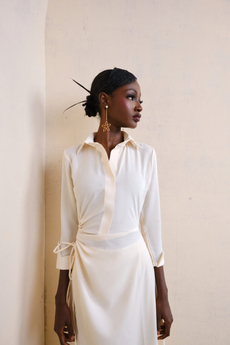 A Cotton shirt with translucent button detailing paired with a ruffle  lace skirt with a zip at the back Model is 5’8 and wearing a…