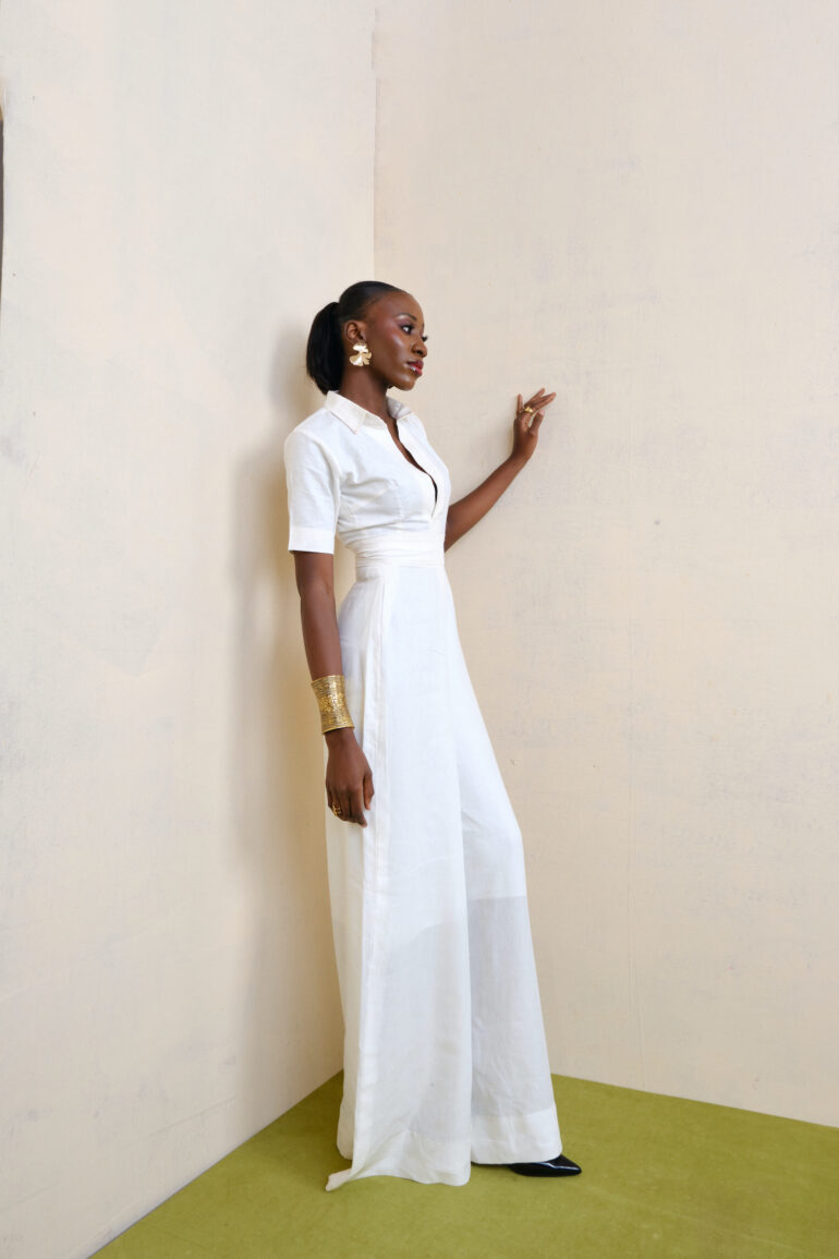 A stretchy jersey top with a draped fabric detailing on the neck paired with khaki palazzo pants with back pocket details with belt holes. Model…