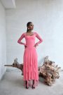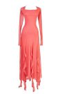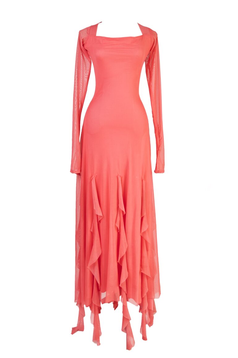 A STRECHY JERSEY WITH RAW SILK FABRIC USED FOR THE FRILLS AND MESH SLEEVES. Long sleeve Side zipper Model is 5'7"" and is wearing a…