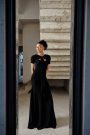 A STRECHY JERSEY WITH RAW SILK FABRIC USED FOR THE FRILLS AND MESH SLEEVES. Long sleeve Side zipper Model is 5'7"" and is wearing a…
